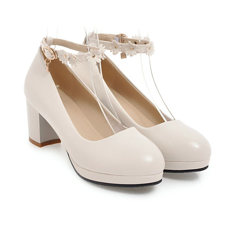 結婚式や二次会に最適なベージュカラーの太ヒールパンプス。